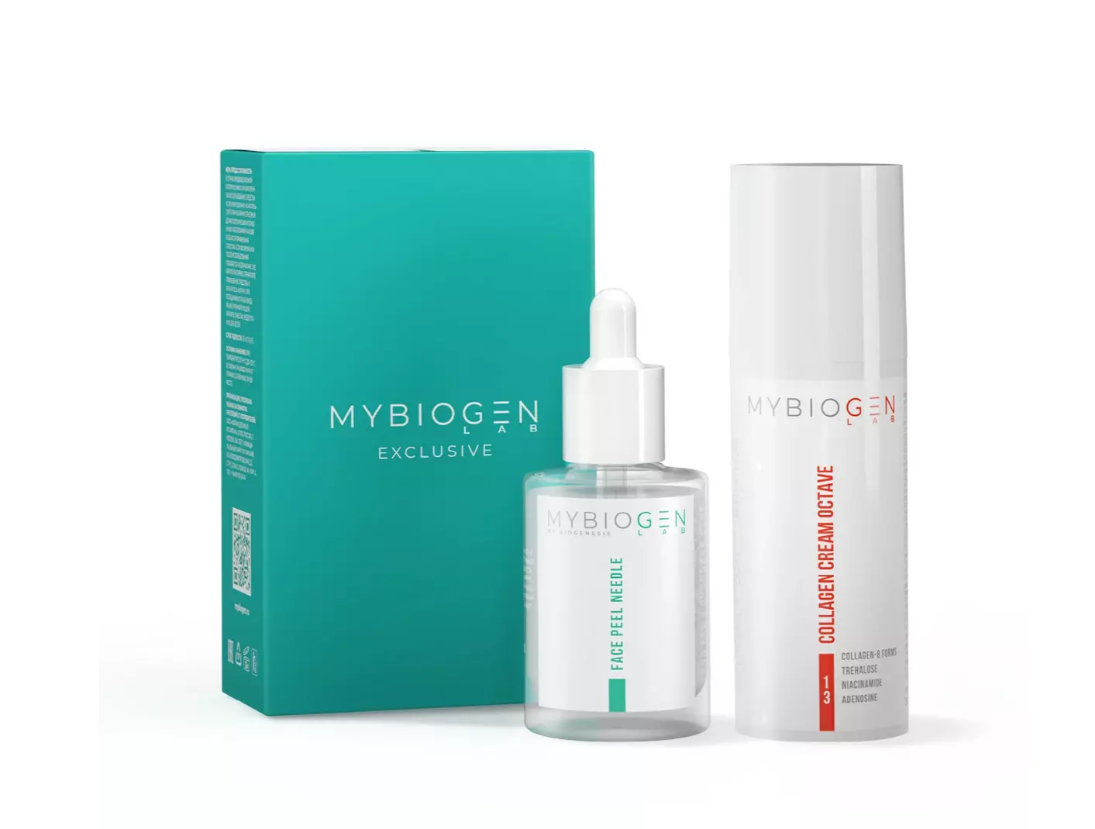 MYBIOGEN «Intensive skin renewal set» — профессиональная система омоложения, в основе которой синергия пилинга с микроспикулами и коллагенового крема. Пилинг создаёт «входные ворота» для активов, улучшает текстуру, уменьшает птоз и ускоряет обновление кожи, а крем закрепляет эффект за счёт мощного комплекса из 8 форм коллагена и репаративных компонентов.